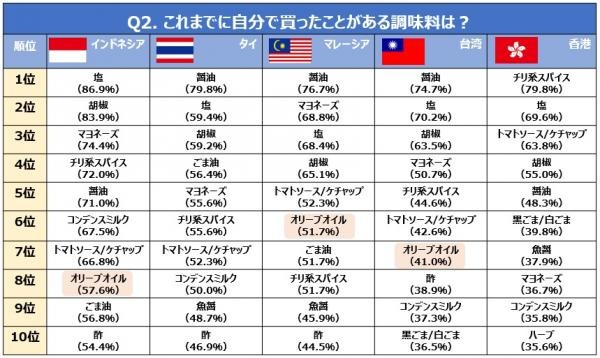 特に同じ中華系でありながら、香港と台湾では使っている調味料が異なるのは興味深いところです。オリーブオイルは、香港ではランク外の9.9%だったのに対し、台湾は41.0%と大きな違いが出ました。台湾では、オリーブオイルを使った新感覚の台湾料理を供するレストランもあり、感度の高い人たちに人気を博しているようです。買ったことがある調味料でパーセンテージが高いのは、同様に、家庭でもオリーブオイルを使った料理を作っているからかもしれません。