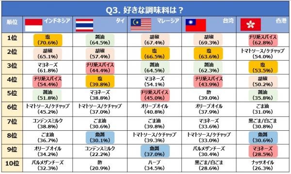 塩が好きと答えた人が最も多かったのはインドネシア。醤油はタイ、胡椒はマレーシアと台湾という結果になりました。塩や胡椒、醤油が人気というのは、あっさりとした味が好みということでしょうか。全体的に、「好きな調味料」は、「家にある」の上位に入った調味料とほぼ同じ結果となりましたが、やはり香港のバラエティの豊かさは注目に値します。