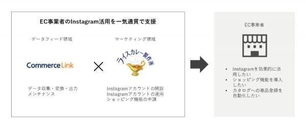 今回の提携では、Instagramアカウントの開設・運用、インスタグラマーの起用、ショッピング機能の申請代行などをライスカレー製作所が行い、カタログ作成や自動更新が必要なアカウントにコマースリンクのデータフィード最適化サービスを提供することで、EC事業者のInstagramマーケティングを包括的に支援するソリューションを提供することが可能となります。