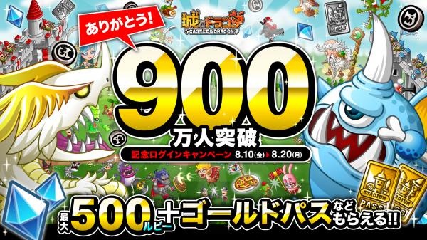 株式会社アソビズム(本社:東京都千代田区、代表取締役:大手智之)は、App Store・Google Playで好評配信中の『城とドラゴン』の登録ユーザー数が900万人を突破したことをお知らせいたします。日頃よりお楽しみいただいているユーザーの皆様へ心より御礼申し上げます。これを記念して8月10日(金)より、ログインするだけで最大500ルビーやゴールドパスなどが手に入る「900万人突破記念ログインキャンペーン」を開催いたします。