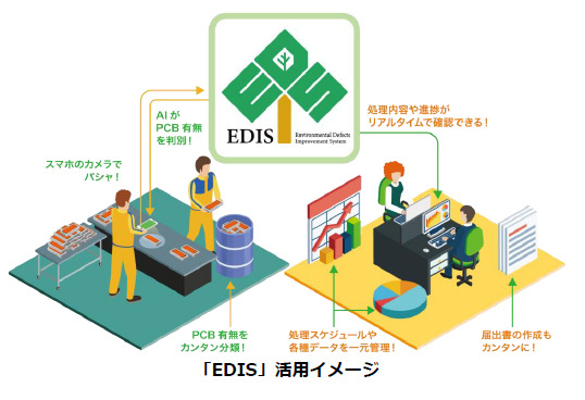 尚、本サービスは、PCB安定器の分別調査とJESCO搬入荷姿登録において、多数の実績を持つ加藤商事株式会社様(本社/東京都東村山市恩多町1-12-3)と共同で開発しました。加藤商事様においては、既に実務でEDISをお使い頂き、現場の作業効率(利用前の比較して2倍以上の効率化の達成)と報告書作成の自動化により多大な成果を上げています。