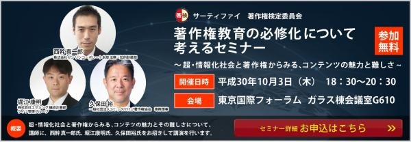 株式会社サーティファイ 著作権検定委員会(以下「サーティファイ」、本社:東京都中央区、代表取締役社長:国山 広一)は、2018年10月3日(水)に東京・丸の内の「東京国際フォーラム」にて、『著作権教育の必修化について考える ~超・情報化社会と著作権からみる、コンテンツの魅力とその難しさ~』と題するセミナーを開催します。近年、コンテンツ大国である我が国においては、国際競争力強化を目的とした、知的財産権(著作権)に精通した人材育成が急務となってきています。サーティファイ著作権検定委員会では、超・情報化社会と著作権からみる、コンテンツの魅力とその難しさについて、又それに伴い「著作権教育」がどのような影響をもたらすかについて、講師に株式会社ゼンリン 西幹 真一郎 氏、株式会社エクシング 堀江 康明 氏、一般社団法人コンピュータソフトウェア著作権協会専務理事 久保田 裕 氏をお招きして、ご講演いただきます。