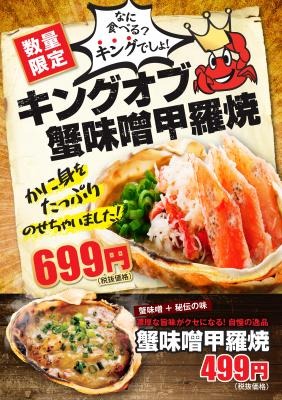 「キングオブ蟹味噌甲羅焼」は、濃厚な旨味がクセになる磯丸水産自慢の「蟹味噌甲羅焼」に、さらに”かに身“と”かに棒肉”をたっぷりのせることで今まで以上にかにの風味が増し、食べ応え十分な逸品となっております。