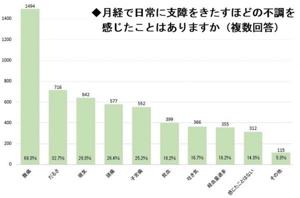 自由回答による「その他」の内容としては、腰痛・下痢・便秘・胃痛・めまい・耳鳴り・胸のはりなどの不調があがりました。中には、足の付け根が痛む、お尻が痛む、排尿痛や排便痛があると答えた方も・・・。