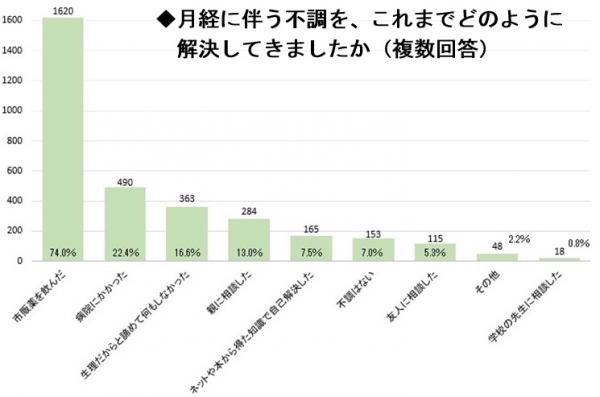 「これまで月経に伴う不調をどのように解決してきましたか」の質問には、約74%の方が「市販薬を飲んだ」と答えています。全回答者のうち「生理だからとあきらめて何もしなかった」方が約16.6%、「不調がない」方が約7%なので、不調があってその解決を望まれた方のほとんどは、これまでに市販薬を飲んで対策をしたことがあると見ることができます。自由回答による「その他」の内容として