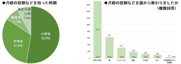 では、最初に月経に関する知識を得たのは、いつ、誰からなのでしょうか。「月経の役割などを知った時期」を質問したところ、過半数は「小学生」ですが「高校卒業以降」と答えた方も8%近くいました。「誰から教えてもらいましたか」を複数回答で聞いたところ、「学校の先生」がもっとも多く約8割、次いで「親」が約3割、「インターネット」は「雑誌」よりも多く1割以上でした。「その他」には、「役割など考えたこともなかった」「妊活を始めてから知った」という回答も。