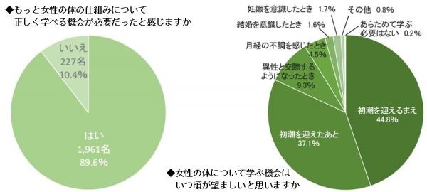 「もっと女性の体の仕組みについて正しく学べる機会が必要だったと感じますか」の質問に対して、およそ9割の方が「はい」と答えています。学習の望ましい時期については、「初潮を迎えるまえ」がもっとも多い約45%、「初潮を迎えたあと」が約37%と続いたほか、「交際するようになったとき」「結婚や妊娠などを意識したとき」など、女性として変化がある時期が挙げられました。「あらためて学ぶ必要はない」と答えた方は2,188名中わずか4名で、多くの方は機会があれば学びたいと考えていることが窺えます。