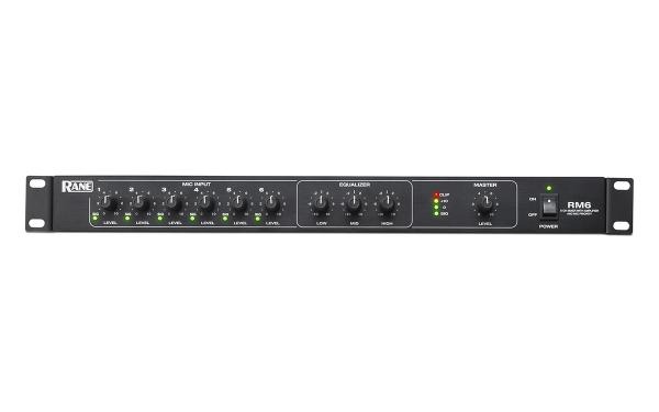 RM6は、マイク/ライン切り替えのコンボ入力端子を備え、さらに120WクラスDアンプを搭載した1Uラックマウント型のアンプ内蔵6チャンネル・ミキサーです。すべての入力チャンネルに、ファンタム電源を備え、マイクとラインの切り替え可能なXLR/TRSのコンボ入力端子と高品位マイクプリを搭載。また、メイン出力には3バンドEQとXLRバランス端子を装備し、モノラルのアンプ出力は、ローインピーダンス・スピーカー(4Ω)にもハイインピーダンス・スピーカー(100V/70V)にも対応したユーロブロック・アンプ出力端子を搭載。汎用性の高い仕様になっています。