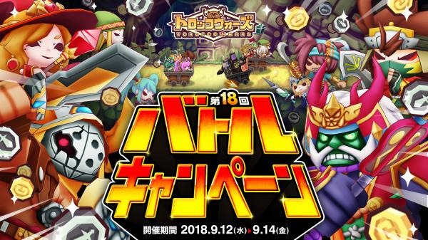 株式会社アソビズム(本社:東京都千代田区、代表取締役:大手智之)は、LINE株式会社(本社:東京都新宿区、代表取締役社長:出澤 剛 以下LINE)との共同タイトル『LINE トロッコウォーズ』で、2018年9月12日(水)より「第18回バトルキャンペーン」を開催いたします。「第18回バトルキャンペーン」は全国のユーザーと競い合い、勝利を重ねて上位ランクを目指すイベントです。今回のバトルキャンペーンはバトルモード「ノーマルバトル」での開催となります。本キャンペーンに参加すると、到達したランクに応じた報酬を手に入れることができます。育てたハンターで腕を競って、大量の報酬を手に入れましょう!