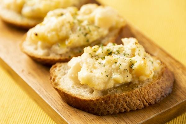 ■豊浦町「噴火湾産ホタテのたたきタルタルをのせたブルスケッタ」噴火湾産ホタテを贅沢にたっぷりのせて。タルタルの酸味と甘みが、新鮮なホタテの旨味を引き立てます