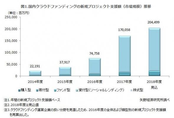 2017年度の国内クラウドファンディング市場規模は新規プロジェクト支援ベースで前年度比127.5%増の1,700億円