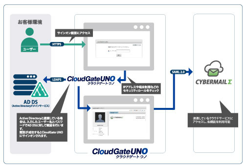 また、CloudGate UNOと連携する他のクラウドサービスとのシングルサインオン(SAML認証)が可能です。一度CYBERMAILΣにCloudGate UNOを経由してログインすることで、連携する他のクラウドサービスへ同時ログインができるので、シームレスにアクセスすることができます。