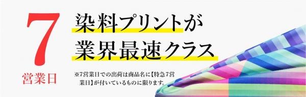 【特急7営業日】を目印に、染料インクジェットプリントで展開中の全6種類の布に対応しています。サンプル用に仕上がりや色味を早くご覧になりたいお客様や、とにかく納期も品質も妥協できないお客様におすすめです。