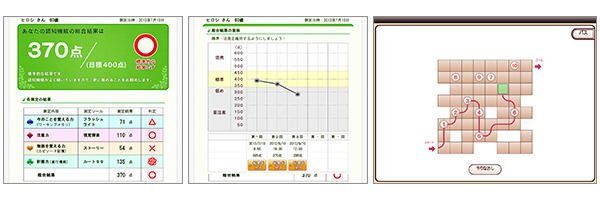 認知機能低下の早期発見を促すと共に、医療機関を早期に受診頂き、治療を行って頂くためのきっかけをご提供します。認知機能の「注意力」「エピソード記憶」「遂行機能」「ワーキングメモリ(作業記憶)」を測定することが可能です。
