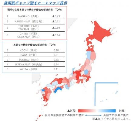 ◆上記ヒートマップの青色が濃い都道府県は英語検索が多く、赤色の濃い都道府県は現地の主要言語での検索が多い。