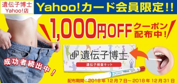キャンペーン内容:『遺伝子博士』Yahoo!店で使える1,000円オフクーポンを配布