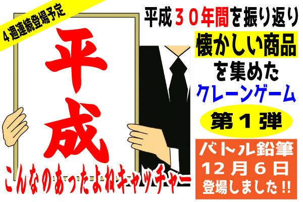 平成こんなのあったよねキャッチャーは、全4弾のクレーンゲームとして、2018年12月、4週連続で登場予定です。