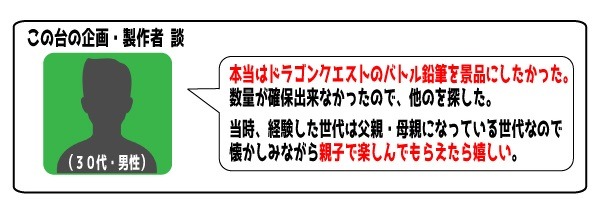 『自分が小学生の時にドラゴンクエストのバトル鉛筆が流行って、学校で友達とバトルをした記憶があります。本当は、当時のドラゴンクエストのバトル鉛筆を景品に採用したかったが、今は製造されてないのか、景品の数が確保が出来なかったので、バトル要素のある他の鉛筆を探しました。当時バトルをやったことのある世代の方が、今は父親・母親世代になっていると思うので、お子さんと懐かしみながら楽しんでもらったり、当時の流行を知らない今のお子さん達にも楽しんでもらえたら嬉しいです。』とのこと。