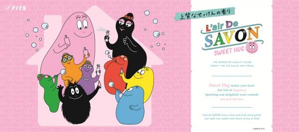 バーバパパファミリーがレールデュサボンの世界観に飛び込み、レールデュサボンの定番カラーであるサボンブルーがピンク色のボトルに、定番であるせっけんの香りがピーチブロッサムの香りとなって、香りも見た目も春の訪れを感じさせる限定商品として登場します。