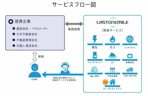 当社事業『ラストワンマイル』とは、提携先の不動産会社顧客に、自社新電力『全国住宅電気』をはじめガス・通信回線などのライフライン、引越し運送の手配・不用品買取など、転居・新生活に関わるあらゆる手続きをワンストップで案内するBtoBtoC事業です。顧客に利便性を与え、提携先企業には収益を分配する新しいビジネスモデルとして注目を集めています。