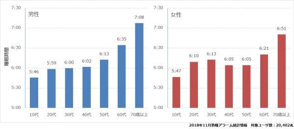 男性は10代<20代<30代<40代<50代<60代<70歳以上の順で平均睡眠時間が長くなり、女性は10代<40代=50代<20代<30代<60代<70歳以上の順で平均睡眠時間が長くなる結果となりました。