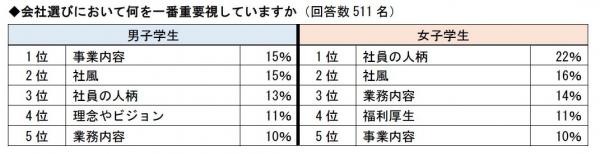 また男性学生は「事業内容」「理念やビジョン」など、企業のビジネスモデルや経営理念を重要視しているのに対し、女性学生は、「社員の人柄」「福利厚生」など、“働きやすさ”を重視している傾向がうかがえ、各企業が優秀な学生を採用する際の指針となるデータが得られました。