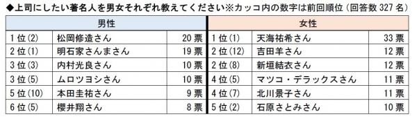 また、上司にしたい著名人を男女それぞれ質問したところ、327名の有効回答が得られました。