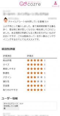 cozre会員の皆様に使用経験のあるチャイルドシートの感想・評価を投稿いただき、独自のおすすめランキングを算出しました。同じチャイルドシートでも、軽自動車、ミニバン、SUVなど、取り付ける自動車の車種次第で評価が異なることもあるため、車種に合わせて絞り込んだランキングを表示することができます。