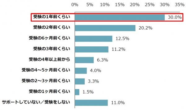 受験を意識して本格的に子どものサポートを開始した時期を聞いたところ、最も多かったのが「受験の1年前くらい(30.0%)」、次いで「受験の2年前くらい(20.2%)」、「受験の6ヶ月前くらい(12.5%)」と続きました。また、「サポートしてない/受験をしない」と回答した方は11.0%でした。