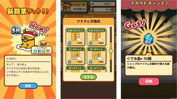 イベント期間中は、ゲーム内でアイテム「ぐで水晶」を集めることで、ショップ内の「アイテム交換」機能から様々なアイテムと「ぐで水晶」を交換することが可能です。本イベント期間のみ入手可能な限定職業「となかい」をはじめ、本作のガチャである「たまごポン」を利用できる「ポンチケット」などお得なアイテムと交換できるこの機会をぜひお見逃しなく!