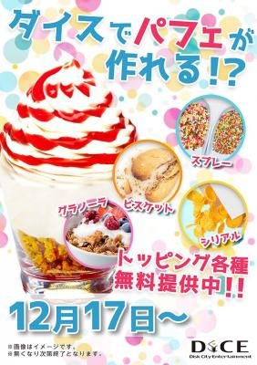 「DiCE池袋店」で多くのお客様からご好評をいただいている無料ソフトクリームコーナーに12月17日より期間限定でパフェ用トッピングをご用意いたします。(提供は無くなり次第終了となります)