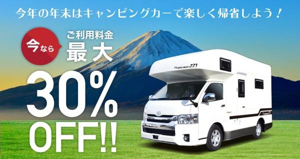 2018年12月28日~2019年1月6日までに3日(72時間)以上レンタルされて帰省する方にご利用料金から10%の割引をいたします!さらに長期割引パックも併用ができるため、利用総額が最大で30%もお安くなる大変お得なキャンペーンです。