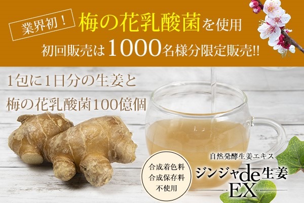 「ジンジャde生姜EX」は、九州産の生姜と酵母とキビ砂糖により発酵・熟成させ、植物由来の梅の花乳酸菌を1包に100億個いれた低糖質な自然発酵食品です。梅の花乳酸菌は非常に貴重な乳酸菌で大量生産が難しく、学会発表後も注目を集め生産が追いついていない状況です。