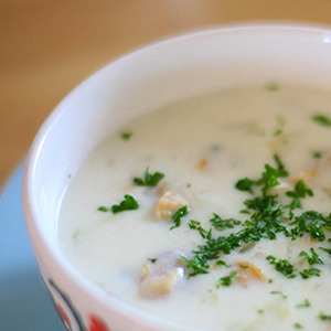 クラムチャウダーは、ホンビノス貝を食材に含んでいれば、スープが赤くても、白くても、緑でもOK。