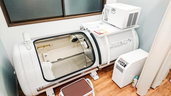 その待ち時間を有効に活用していただけるよう、酸素カプセルを導入致しました。静かな通りに面し、パーティションとカーテンで仕切っているので、落ち着いた空間になっています。