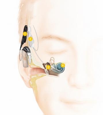 3. インプラントは、受信したデジタル信号を電気信号に変換し、蝸牛に挿入されている電極(3)に送ります。
