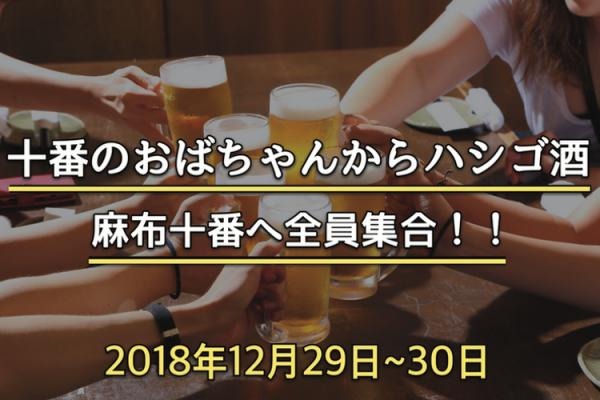 仕事などで年末の予定が立たないまま都内に居る人の為に開催する、『十番のおばちゃんからハシゴ酒』。本イベントは、リストバンドを購入すると、チャージ料、お通し代がかからず、本イベントの各参加店を、自由にはしごする事ができる、お得なハシゴ酒イベントです。今回は、麻布十番1~4丁目に、それぞれジャンルの違う、個性豊かな、厳選した7店舗をご用意いたしました!各店では、お酒1杯、390円で呑める他、本イベント限定の、「各店自慢のグルメ+お酒のセット」もご用意!「笑いあり!美酒・美食あり!出会いあり♪」そんな素敵な2日間で2018年を締めくくりましょう!