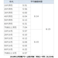 睡眠アプリの統計調査|年代ごとの平均睡眠時間(2018年12月度)