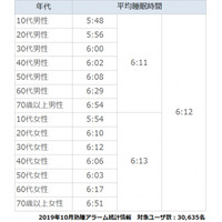 2019年10月度の睡眠統計調査|年代ごとの平均睡眠時間