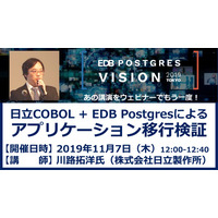 EDBは日立製作所 川路拓洋氏を講師に「日立COBOL + EDB Postgresによるアプリケーション移行検証」と題するウェビナーを2019年11月7日(木)ランチタイムに開催いたします。