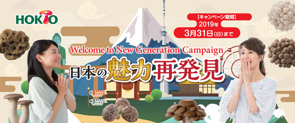 きのこ総合企業のホクト株式会社(所在地:長野県長野市、代表取締役社長 水野雅義)では、新たな時代を迎える今、“改めて日本の魅力を実感していただける旅行券”や“日本人の技と心が生んだ感動の品”を送る「Welcome New Generation Campaign 日本の魅力再発見」を開催しています。キャンペーン期間は2019年1月1日から3月31日まで。