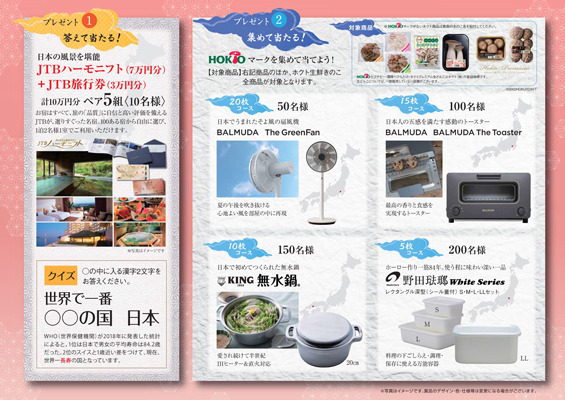 クイズに正解するとJTBハーモニフト(7万円分)+JTB旅行券(3万円分)合計10万円分の旅行を抽選で5組10名様にプレゼント。また、ホクトのきのこのパッケージに付いているHOKTOマークを必要枚数分集めてご応募いただくとBALMUDA The GreenFanやBALMUDA BALMUDA The Toaster、KING 無水鍋、野田琺瑯 White Seriesの4種類が合計500名様に当たります。