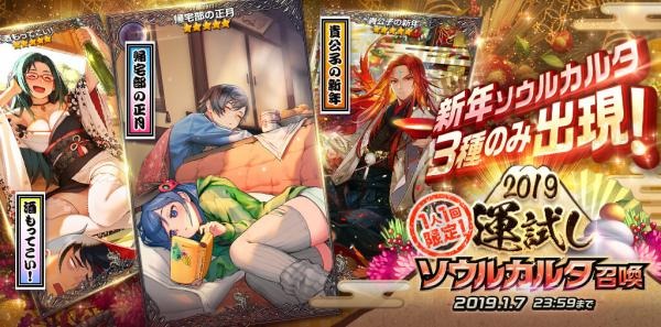 また、今回初登場となる★5ソウルカルタ「帰宅部の正月」「酒もってこい!」「貴公子の新年」の3種のみが出現する1人1回限定の「2019運試しソウルカルタ召喚」もあわせて開始となりました。