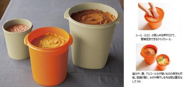 仕込んでから半年ほど熟成させて完成するみそ作りには、美味しく熟成させ、失敗なく作るためにも、優れた密封容器が必須。デコレーターシリーズでは、たっぷり10Kgのみそを作れるサイズから、初心者にも扱いやすいサイズまで、3つのサイズをご用意しています。(うち1サイズ「グランプリデコレーターL」は数量限定)いずれも、ワンプッシュで簡単に密封することができる、クイックシールタイプ。シール(ふた)の真ん中を押すだけの手軽さに加え、逆さにしても安心の水もれ防止構造で、匂いや水分をもらしません。酸や塩分、アルコールにも強いので梅干しや梅酒作りにも適しています。