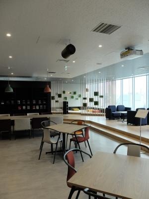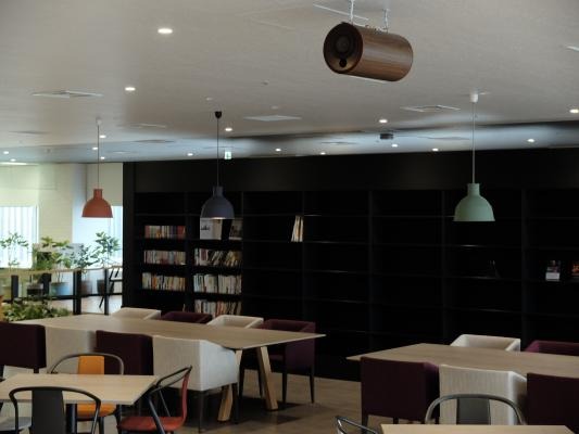 リラックスできるカジュアルなラウンジスペースも設け、昼食後は打ち合わせや、ミーティング、プロジェクト会議などにも利用できるように配慮。さらには気持ちの良い音が流れるマッサージルームも完備。天井に吊り下げ型で設置されているのが、音のエア・コン機能を持つスピーカーMS1001です。