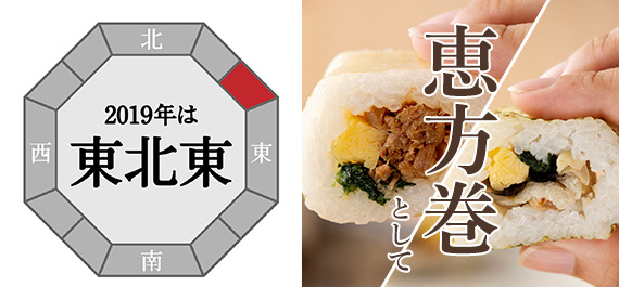恵方巻きは、節分の日(2月3日)に福徳を司る神様がいる方方角に向って食べると縁起が良いとされています。2019年の恵方は「東北東」です。一般的には一本ものの巻き寿司が主流ですが、今回の商品は食べやすさを重視してカットしています。(8切れカット)