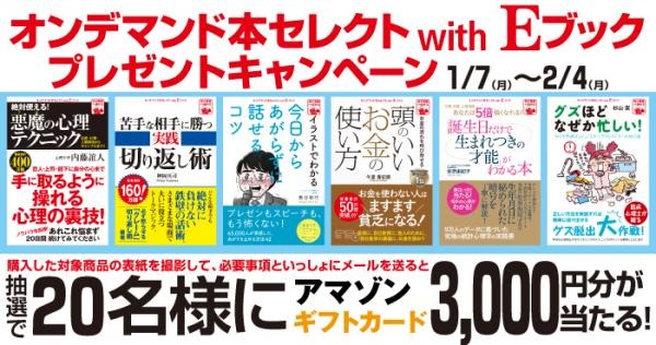 ☆キャンペーン内容:期間中、対象の「オンデマンド本セレクトwith Eブック」を購入すると、抽選で20名様にアマゾンギフトカード3,000円分をプレゼントいたします。