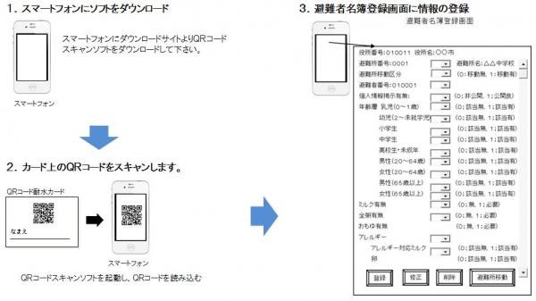 QRコードを印刷したカード事前に各避難所に1,000枚(名刺サイズ)備蓄し、被災時にそのカードを各一人1枚渡してスマートフォンのQRコードスキャンソフト(無料ダウンロードソフト)からスキャンすると、1枚一人の個人番号で登録画面がスマートフォンに表示され必要な情報を登録できます。