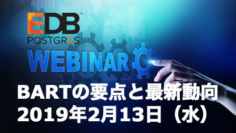 エンタープライズDB(EDB)では、来たる 2月13日(水)のランチタイムにEDB Backup and Recovery Tool(BART)に関するウェビナーを開催いたします。