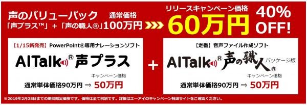 さらにエーアイでは、1月15日から2月28日までの期間限定で、「AITalk(R) 声プラスTM」リリースを記念したキャンペーンを実施します。対象製品は「AITalk(R) 声プラスTM」と定番の音声ファイル作成ソフト「AITalk(R) 声の職人(R)」、そして両製品がセットでお得な「声のバリューパック」です。